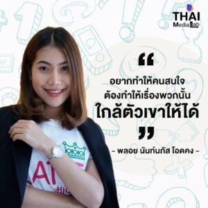 พลอย – นันท์นภัส โอดคง Content Creator บุญมีฤทธิ์ และเป็นรุ่นพี่วารสารศาสตร์คอนเวอร์เจ้นท์ สถาบันการจัดการปัญญาภิวัฒน์ เป็นดอกผลจากกระบวนการ #MediaLab ได้เล่ามุมมองของการคิดเรื่องที่อยากเปลี่ยนความคิด กระตุ้นคิด เปลี่ยนแปลงสังคม