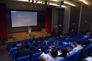 ภาพบรรยากาศงาน ‘From Innovation to Entrepreneur นวัตกรรมการสื่อสารสร้างสรรค์สู่การเป็นผู้ประกอบการ’ โดยประธานและวิทยากรเดินทางเข้ามาภายในงานเป็นที่เรียบร้อย ซึ่งวิทยากรประกอบไปด้วย